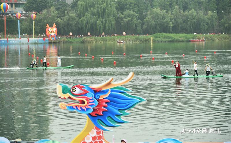 ▲6月18日,“邮储银行杯”2023“甜城湖·绿水青山”中国休闲运动首届挑战赛暨内江第十一届大千龙舟文化节在大洲广场主舞台举行,图为水上表演。