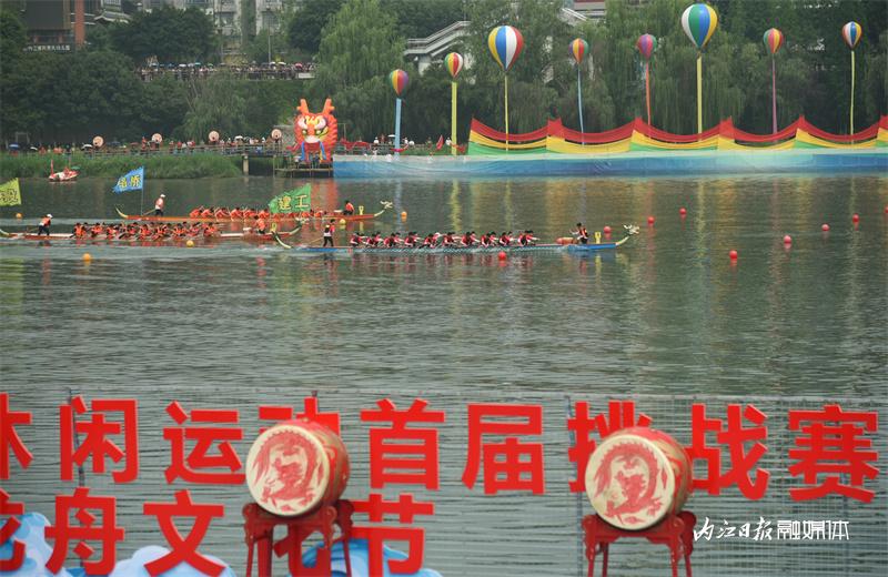 ▲6月18日,“邮储银行杯”2023“甜城湖·绿水青山”中国休闲运动首届挑战赛暨内江第十一届大千龙舟文化节在大洲广场主舞台举行,图为龙舟竞渡。