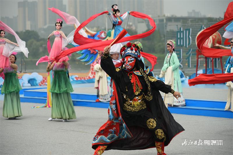 ▲6月18日,“邮储银行杯”2023“甜城湖·绿水青山”中国休闲运动首届挑战赛暨内江第十一届大千龙舟文化节在大洲广场主舞台举行,图为戏曲表演。