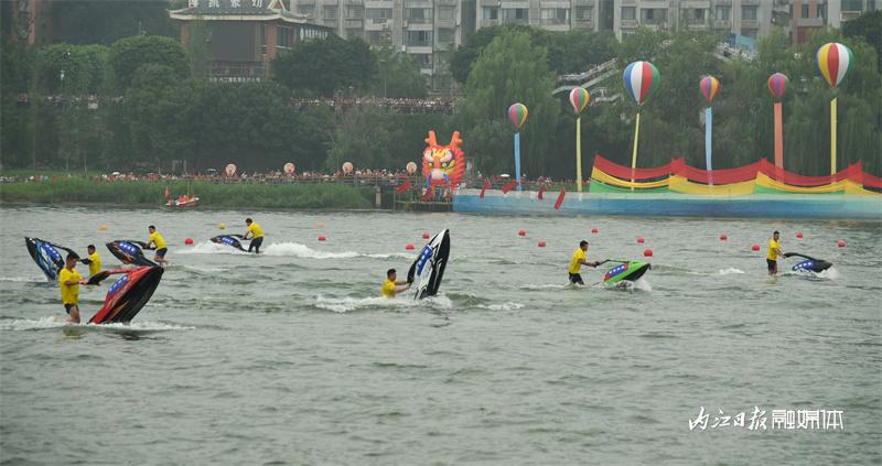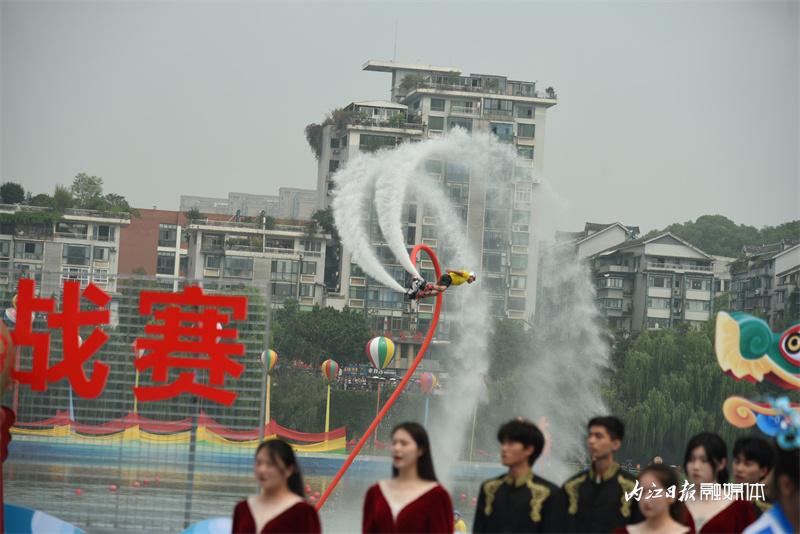▲6月18日,“邮储银行杯”2023“甜城湖·绿水青山”中国休闲运动首届挑战赛暨内江第十一届大千龙舟文化节在大洲广场主舞台举行,图为水上特技。
