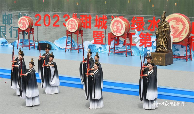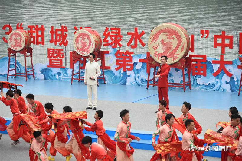 6月18日,“邮储银行杯”2023“甜城湖·绿水青山”中国休闲运动首届挑战赛暨内江第十一届大千龙舟文化节在大洲广场主舞台拉开帷幕。3大篇章,上千名演员,覆盖“水陆空”的精彩表演,展现了“甜蜜内江”的独特风貌。