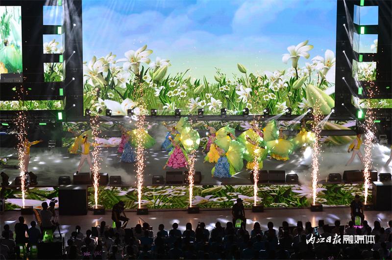 ▲6月19日晚,“东兴•中国天冬之乡”大型明星演唱会在内江市体育中心举行。图为歌舞表演《天冬花儿开》。