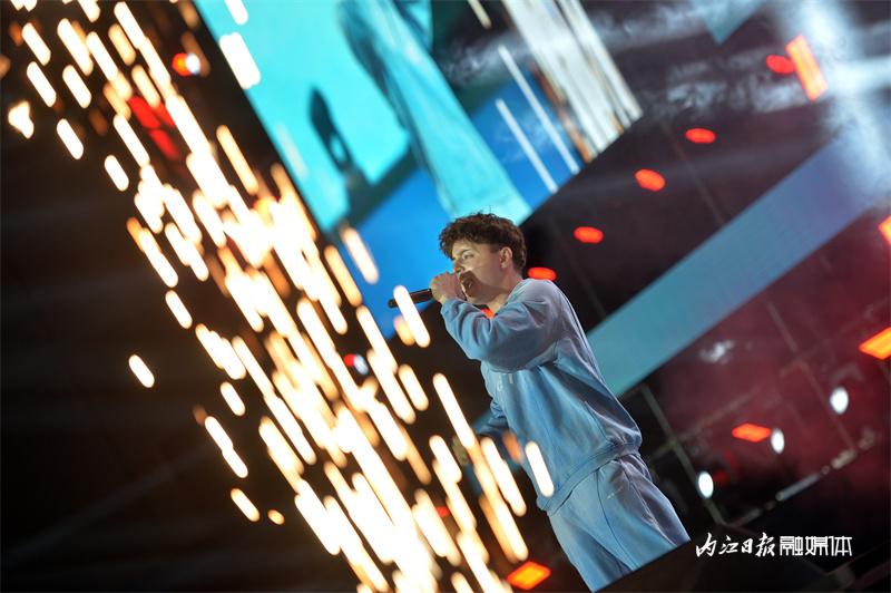 ▲6月19日晚,“东兴•中国天冬之乡”大型明星演唱会在内江市体育中心举行。图为歌手阿尔法在演唱歌曲。