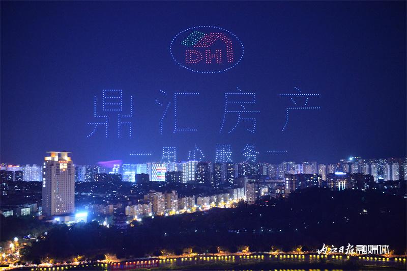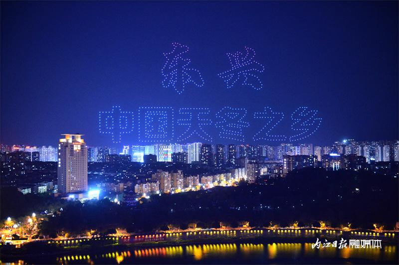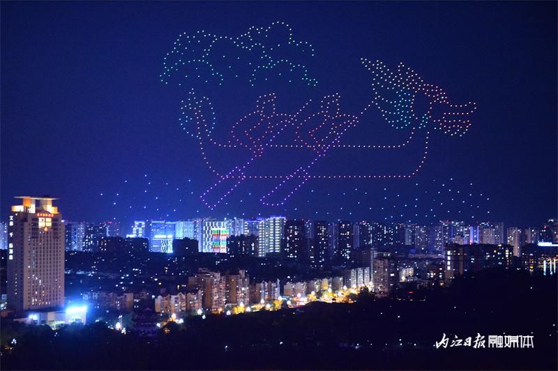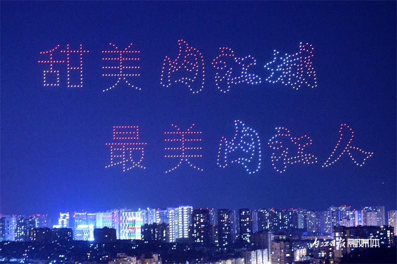 ▲6月24日晚,800架无人机灯光秀再次在内江上演。图为“大千故里 甜美内江”造型。