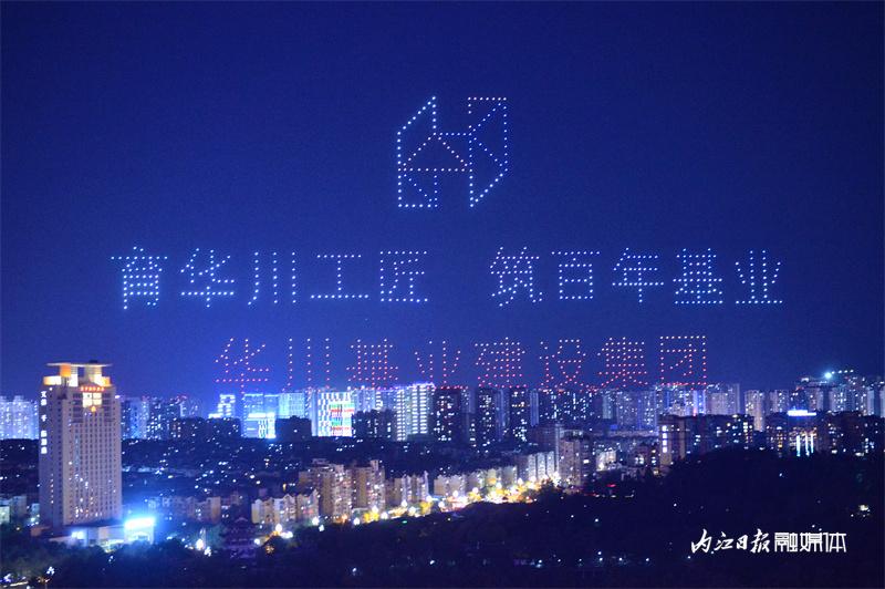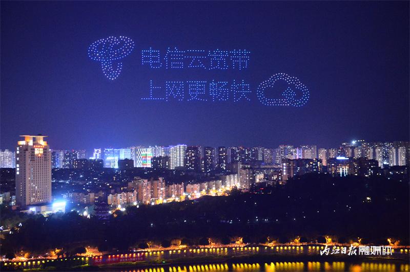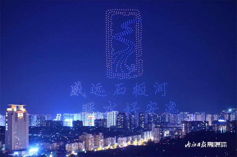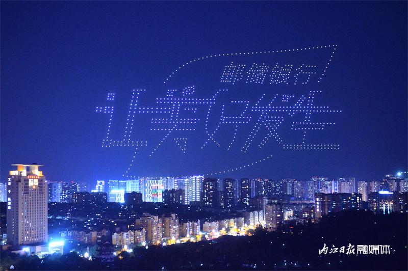 ▲6月24日晚,800架无人机灯光秀再次在内江上演。图为文字造型。
