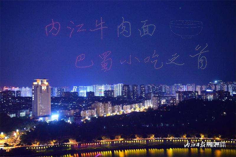 ▲6月24日晚,800架无人机灯光秀再次在内江上演。图为“内江牛肉面 巴蜀小吃之首”造型。