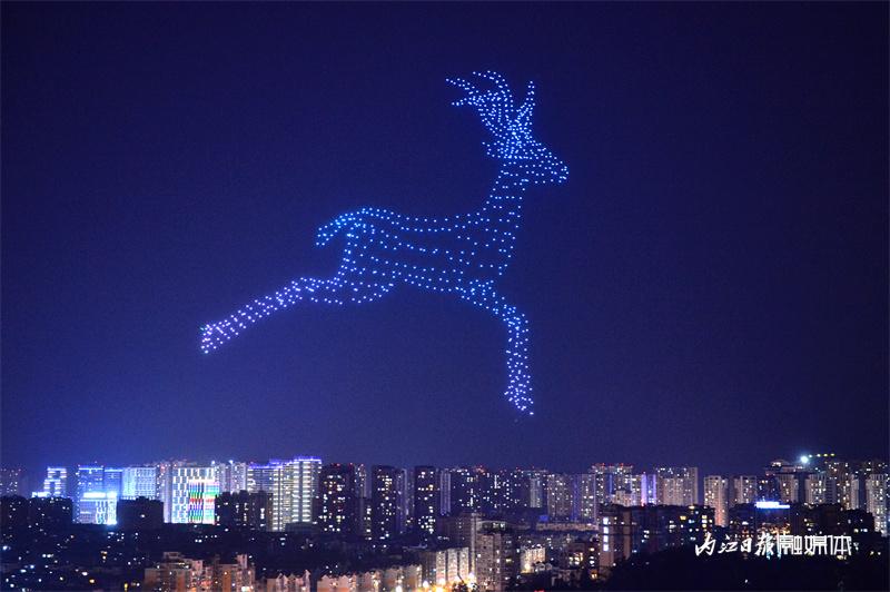 ▲6月24日晚,800架无人机灯光秀再次在内江上演。图为“飞鹿”造型。