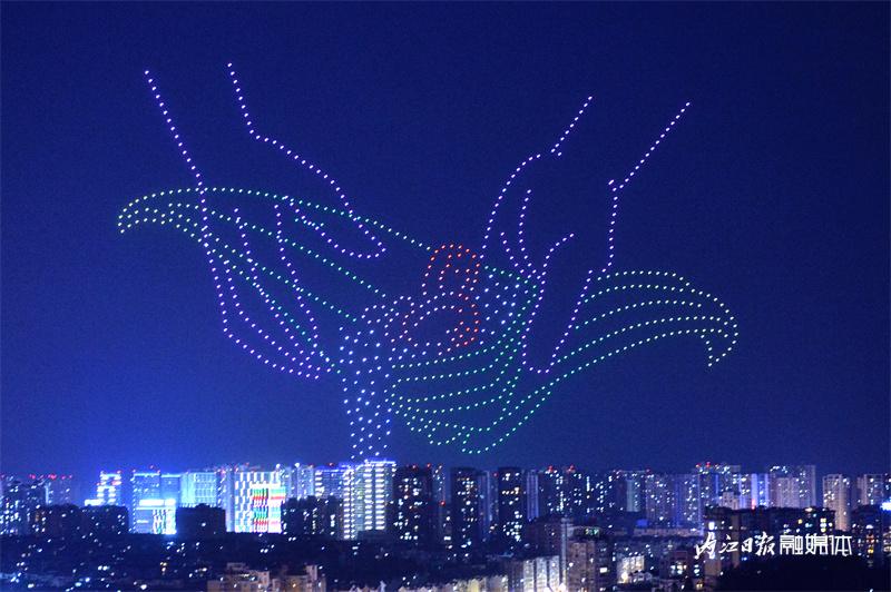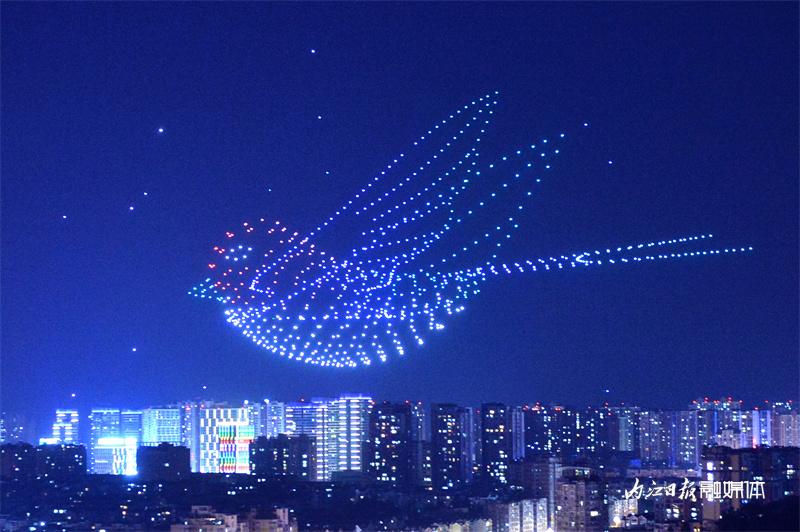 ▲6月24日晚,800架无人机灯光秀再次在内江上演。图为“飞鸟”造型。