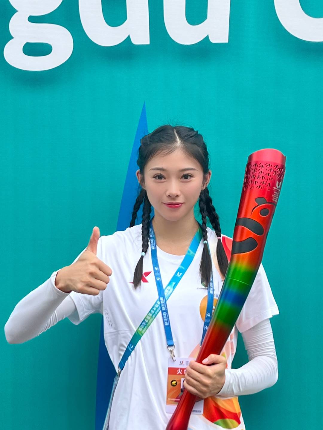 7月26日,成都大运会火炬在成都大学站传递。刚刚在2023年全国田径冠军赛暨世锦赛及亚运会选拔赛女子100米栏赛事中获得冠军的吴艳妮成为本站火炬手。