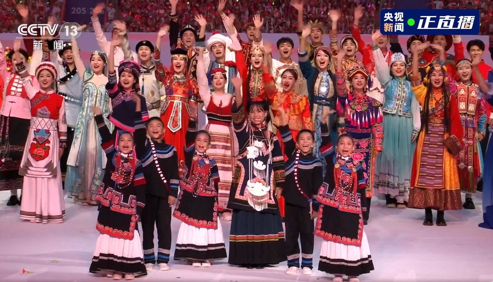 在吉好有果的领唱之下,56个民族的代表们身着民族服饰共同唱响了《国旗国旗真美丽》和《歌唱祖国》。看着电视直播的镜头,一家人都觉得,吉好有果脸颊的酒窝更可爱了。