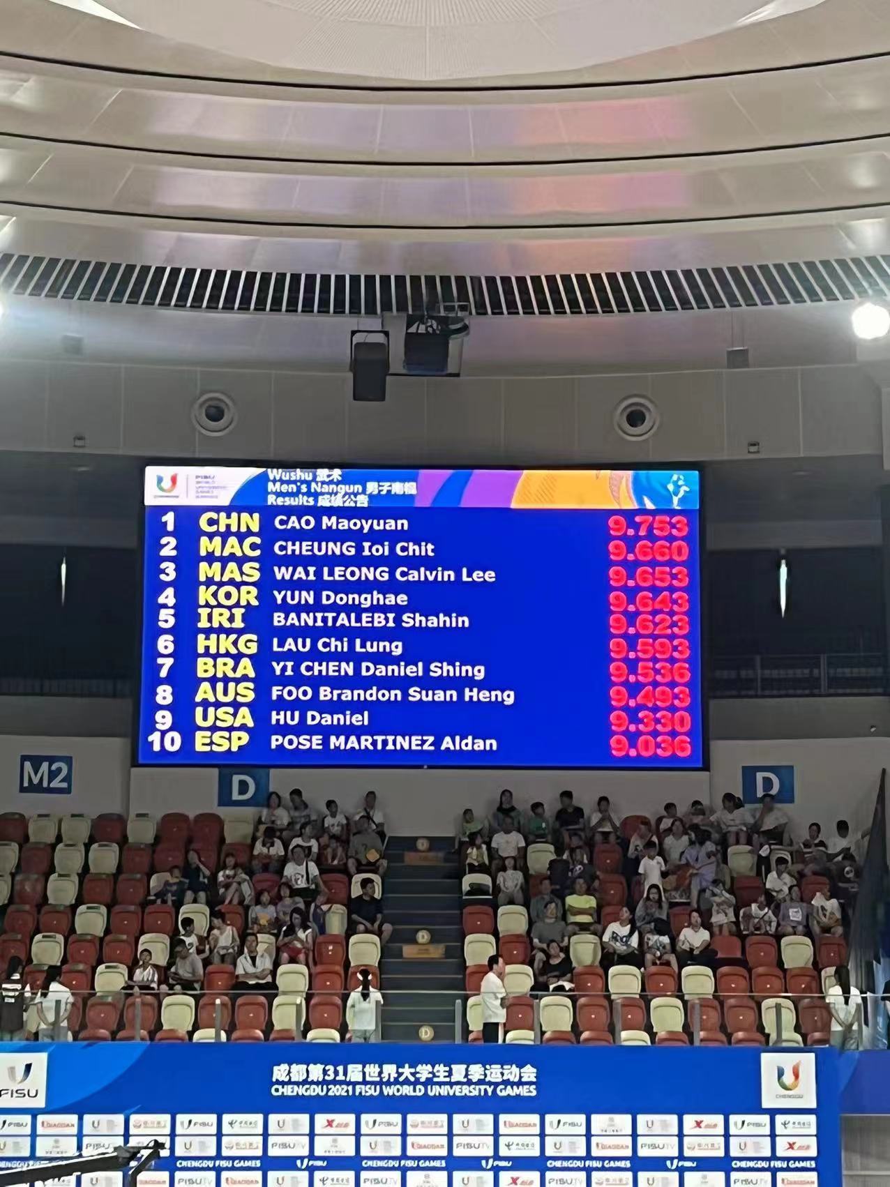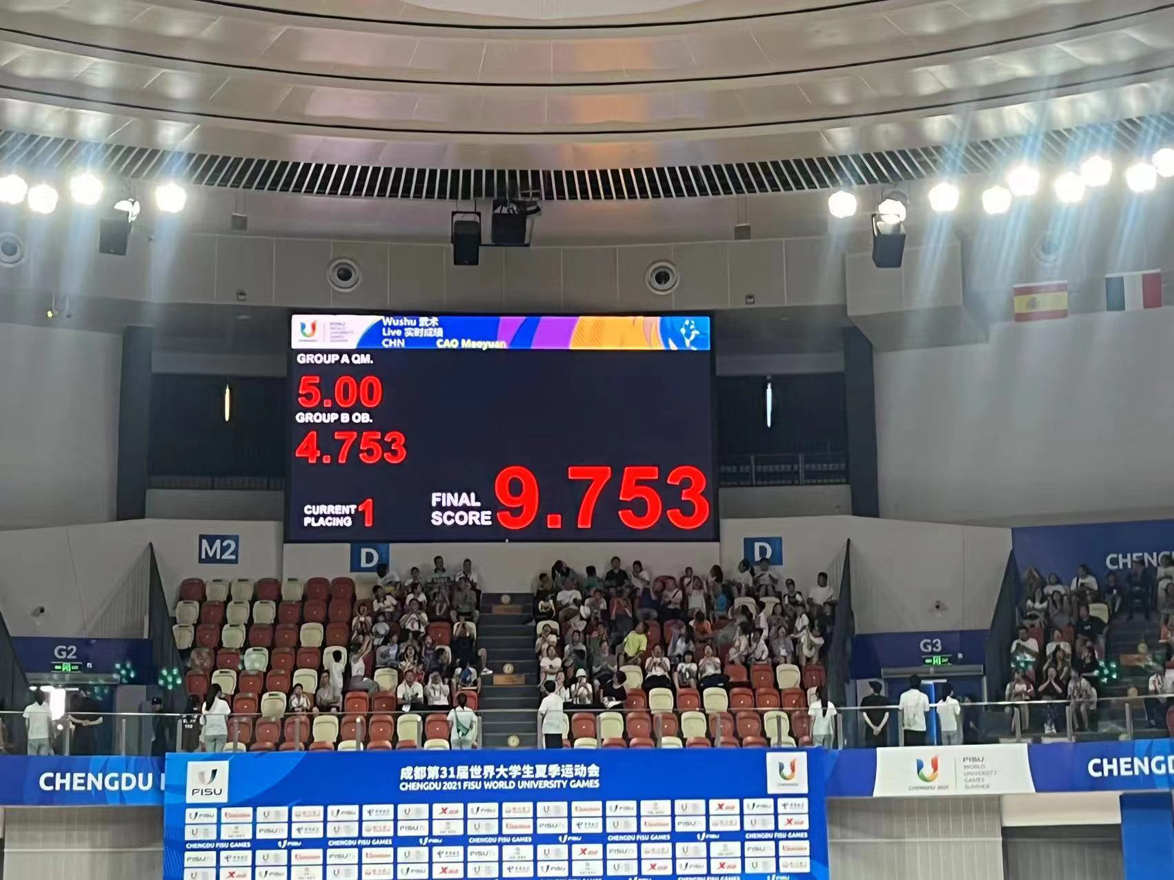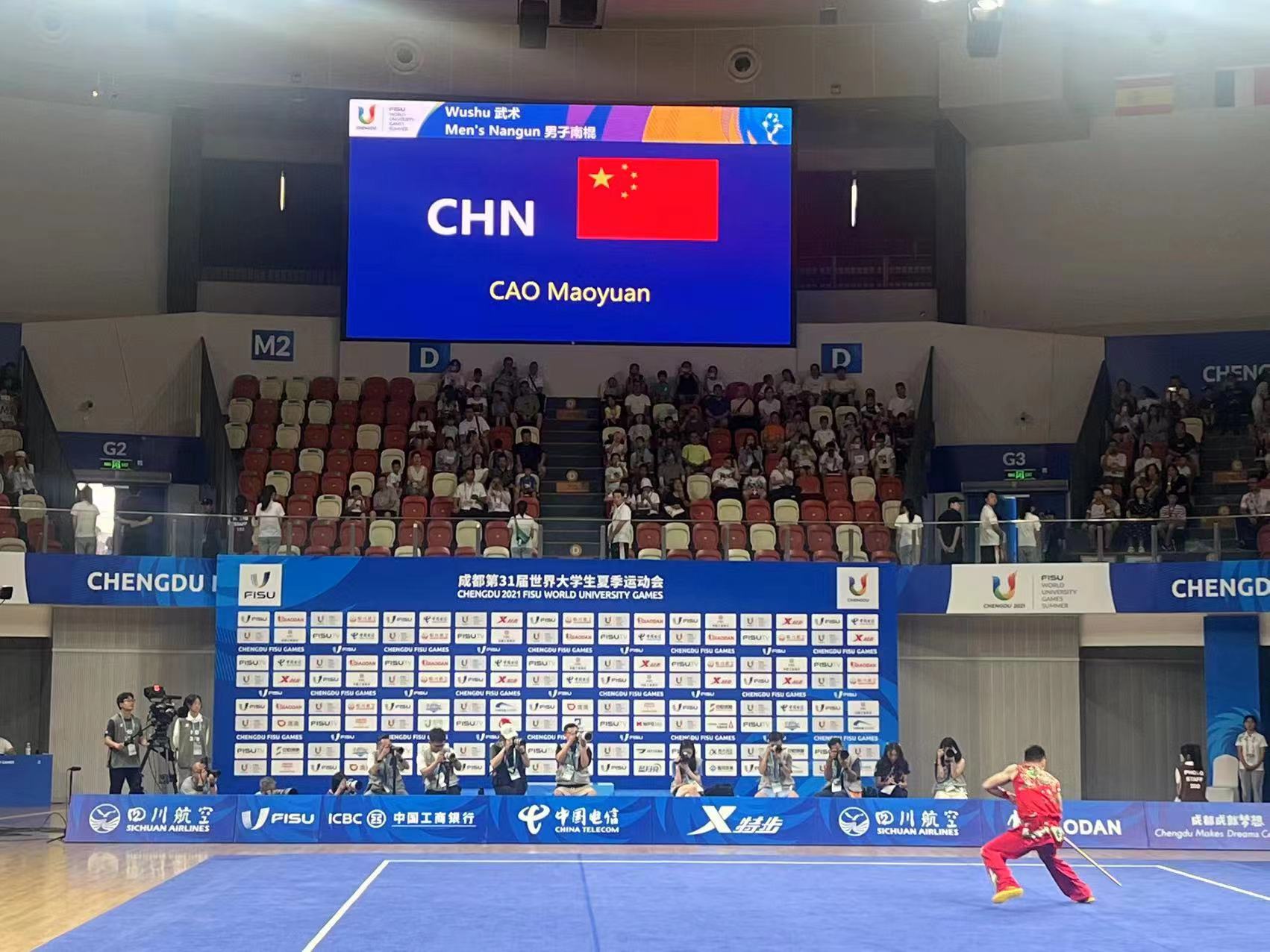 7月30日,成都大运会武术项目男子南棍比赛中,中国选手曹茂园以9.753分夺冠,继昨天获得首金后,再为中国大学生体育代表队斩获一枚金牌。