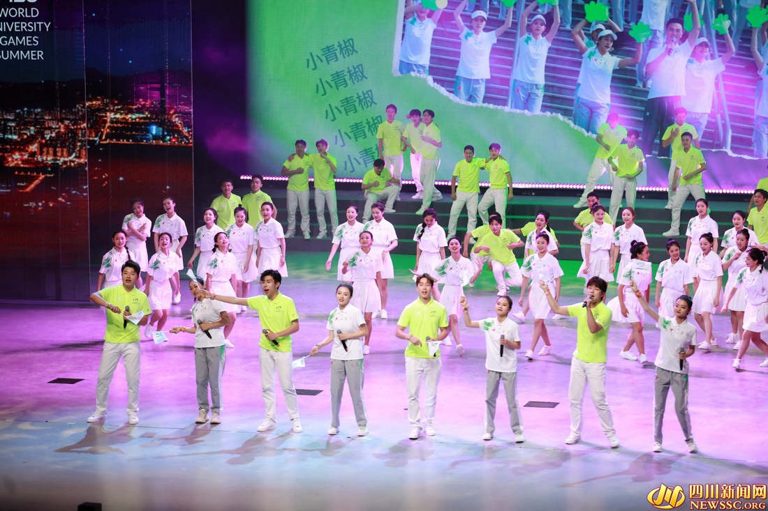 当成都大运会的志愿者歌曲《小青椒之歌》响起时,很多志愿者们熟练地做起了动作,现场的大学生运动员们也跟着学了起来。有的运动员还用拥抱来感谢一直为他们热情服务的志愿者“小青椒”们。