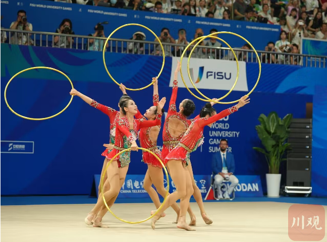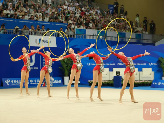 一抹红色,穿越激昂的鼓点,将意蕴连绵的中国传统文化带到世界赛场。7月31日,成都大运会艺术体操“集体5圈”项目上,来自中国队的五朵“小花”,用曼妙的身姿演绎出“花木兰”故事,并以30.900得分,摘得金牌。继集体全能后,这是中国艺术体操在本届大运会上收获的第二枚金牌。