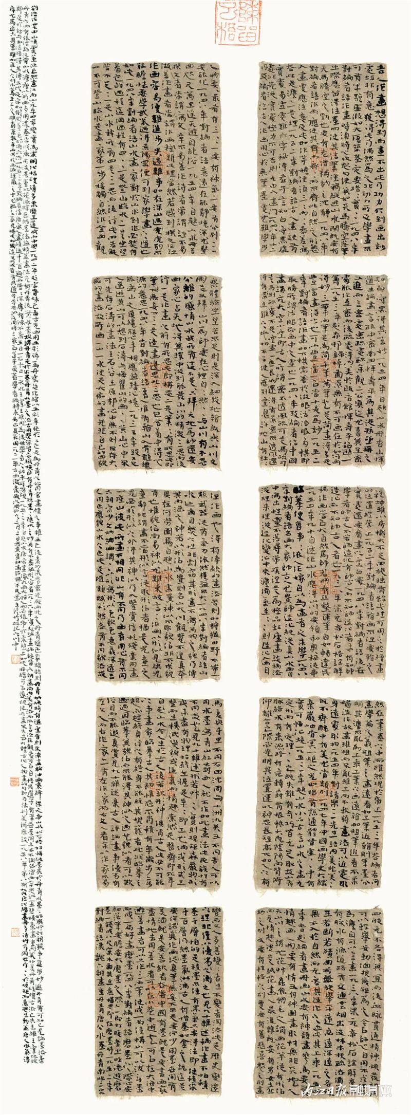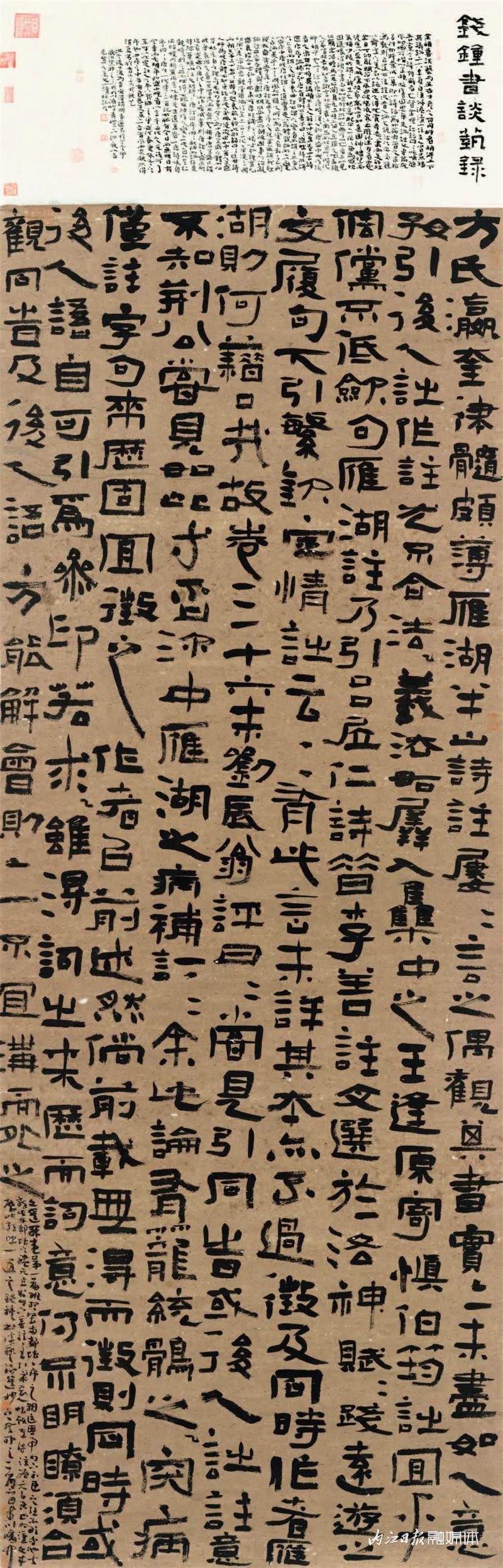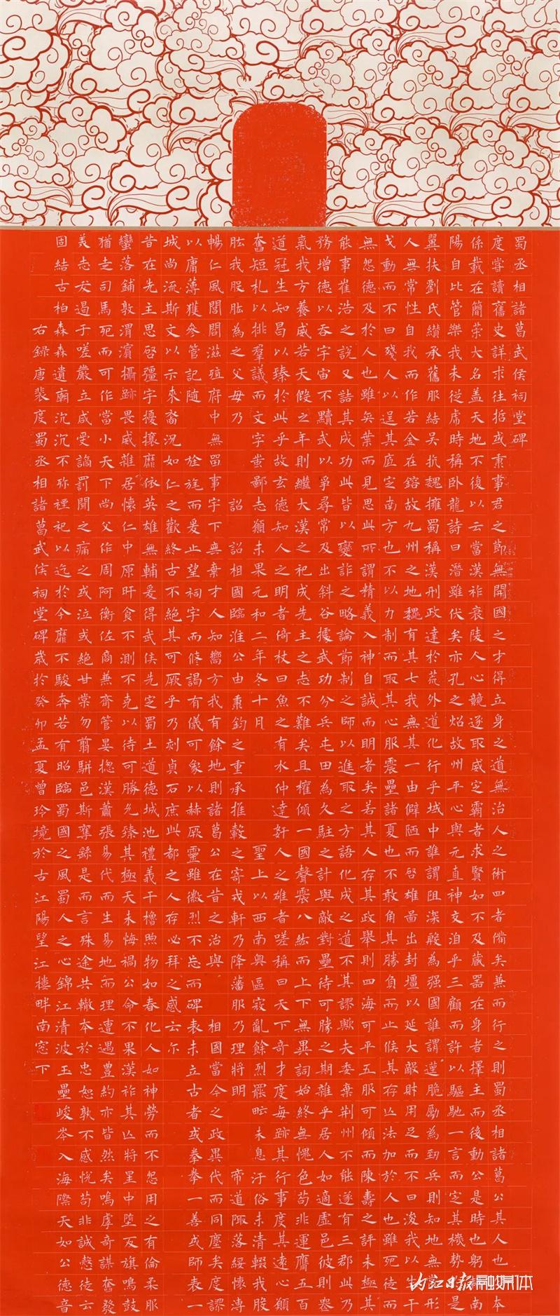 作品旁配发的《创作手记》是此次展览的一大亮点。曾玲境在《创作手记》中详细描述了《蜀丞相诸葛武侯祠堂碑》的内容特点,该作品以褚遂良《雁塔圣教序》为基调,采用八尺整张满构图形式,用朱拓作品用纸,仿古色颜料书写。力求静穆庄重又不失灵动,彰显一种庙堂正大气象;而陈亮则重点叙述了创作两幅作品的背景和经过,并分享了自己学习书法的路径与技巧。