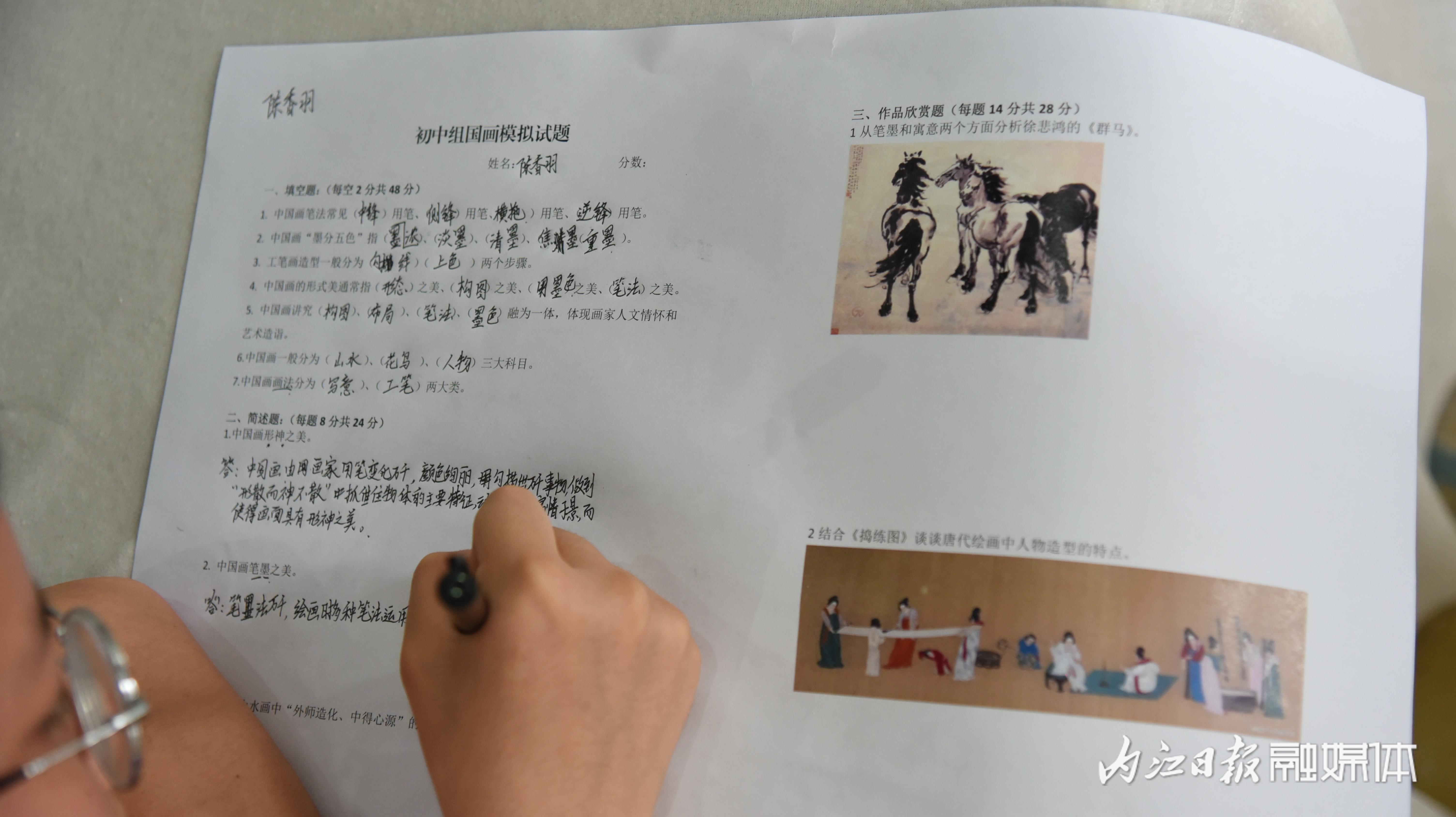 下午是国画理论测验,导师从中小学美术教材和书画传习大赛的比赛大纲中选取题目,按小学、初中、高中(中职)三个组别,出三套试卷,考验学员对国画的基础知识掌握情况。学员们在40分钟内完成试卷。
