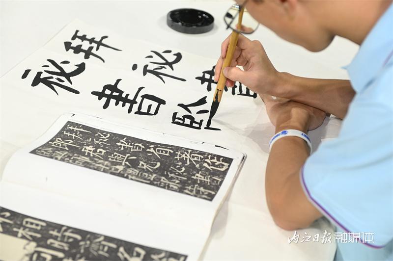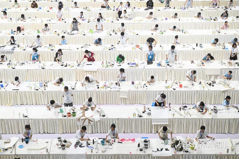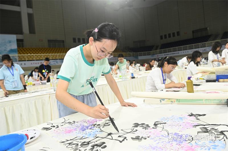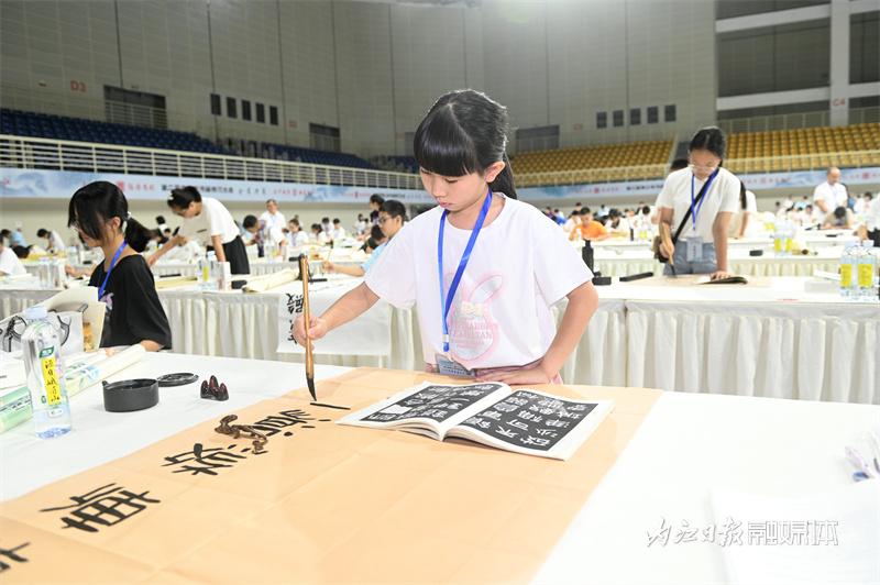 ▲8月23日,内江市体育中心,参赛选手现场创作书画作品 。