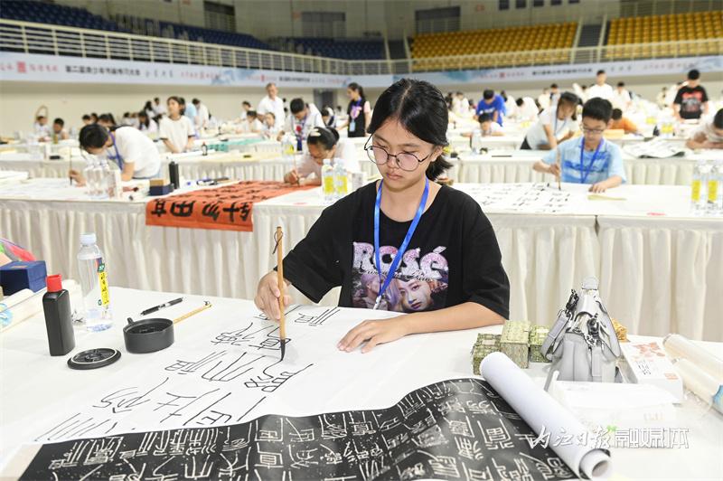 比赛现场,参赛选手分为小学组、初中组和高中(中职)组,进行了书画素养和书画创作的比拼。其中,“书画素养”比拼计时40分钟,“现场创作”比拼计时180分钟。