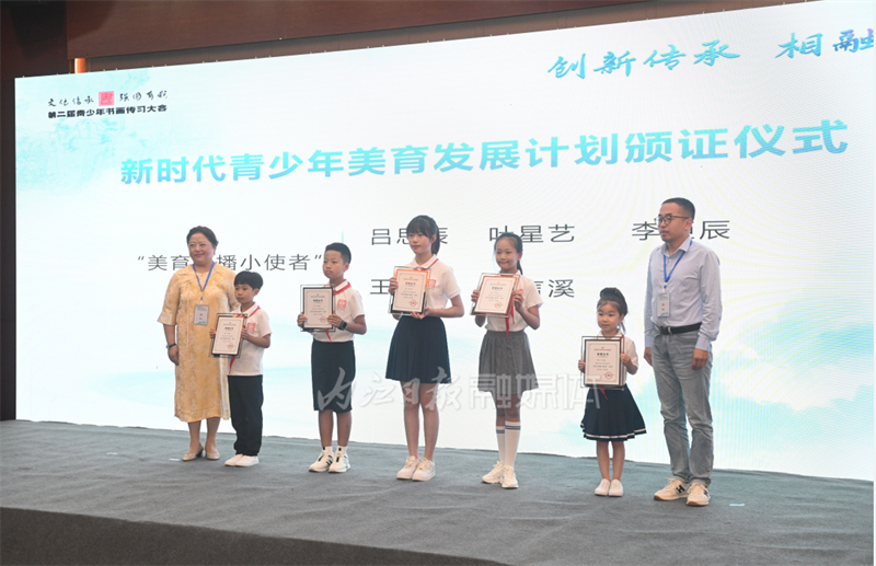 当天,与会嘉宾观看了由青少年美育研究院影视制作中心特别策划拍摄制作的宣传视频,并现场见证了美育发展计划导师聘任仪式和“美育传播小使者”颁证仪式。