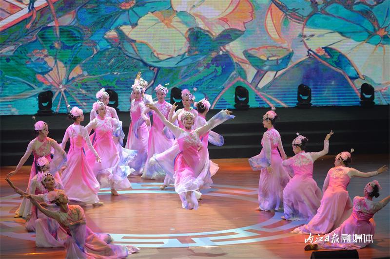▲8月24日晚,第二届青少年书画传习大会嘉年华之夜在内江师范学院苌弘剧院举行。图为文艺表演《翰墨荷香》。