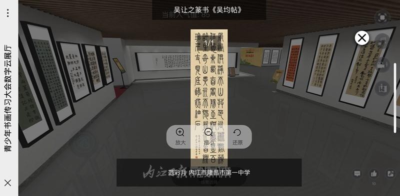 参观什么呢?负责讲解工作的四川新传媒集团工作人员沐恒辉介绍,在征得作者本人同意的基础上,数字云展厅利用数字化技术等新手段,对首届青少年书画传习大会参赛获奖作品、教学优秀课例及四川省非遗书画产业情况等进行了永久数字化保存和线上展示。其中,展出书法作品(含临摹)103件、国画作品50件。