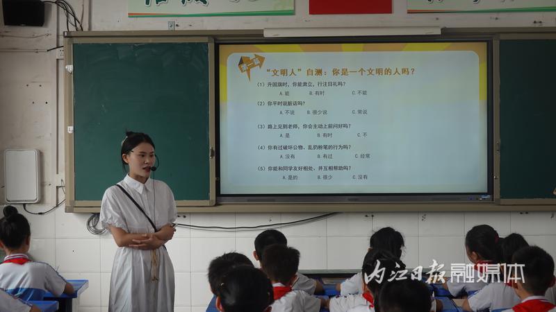 严陵镇中心校3年级5班则以“争做文明学生 创建文明城市”为主题,为同学们带来了别开生面的开学第一课。
