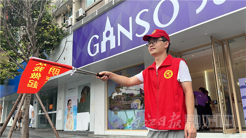 近日,记者见到张帅时,他正头戴文明劝导帽、手持小红旗、身穿红马甲,站在市中区公园街新华书店外的斑马线前,劝阻行人不按指示灯过马路、车辆占用斑马线停放等不文明行为。