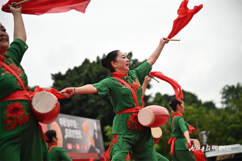 9月22日,大美汉安文化广场——2023“迎国庆·颂中秋”汉安腰鼓舞展演在内江吾悦广场举行,吸引了不少市民前来围观。