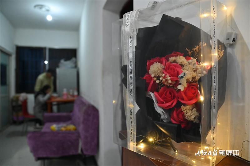 “好漂亮的花啊!”一切收拾妥当后,小辛被新家鞋柜上的一束鲜花吸引,这是房东李键为小辛准备的一个惊喜。小辛捧着花,志愿者为她打开花束上的彩灯开关,在五光十色的彩灯映照下,小辛的笑容像花儿一样甜美。
