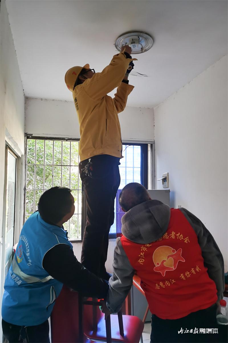 志愿者整理房间时发现,小卧室的床板有点破损,客餐厅的灯不亮,志愿者朱德斌马上联系自己工地的工人前来维修。