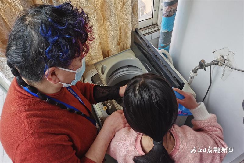 “来,小辛,你看哈,冰箱上面是保鲜层,下面是冷冻层,蔬菜要放上面,肉类要放下面……”志愿者张顺碧牵起小辛的手,耐心地教她家用电器的使用方法和注意事项。