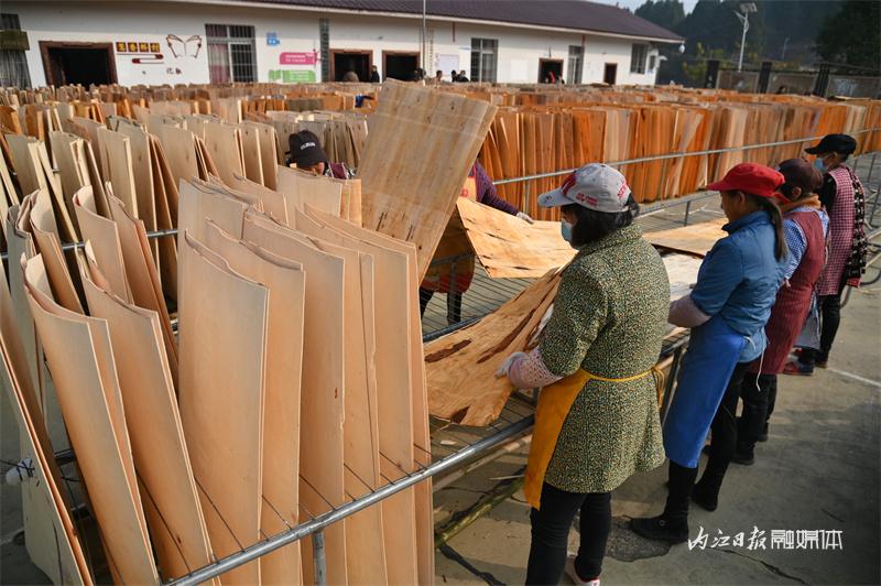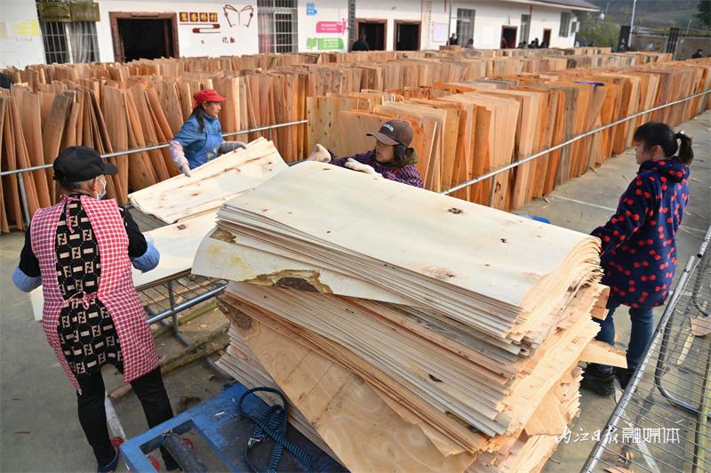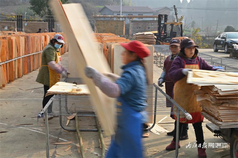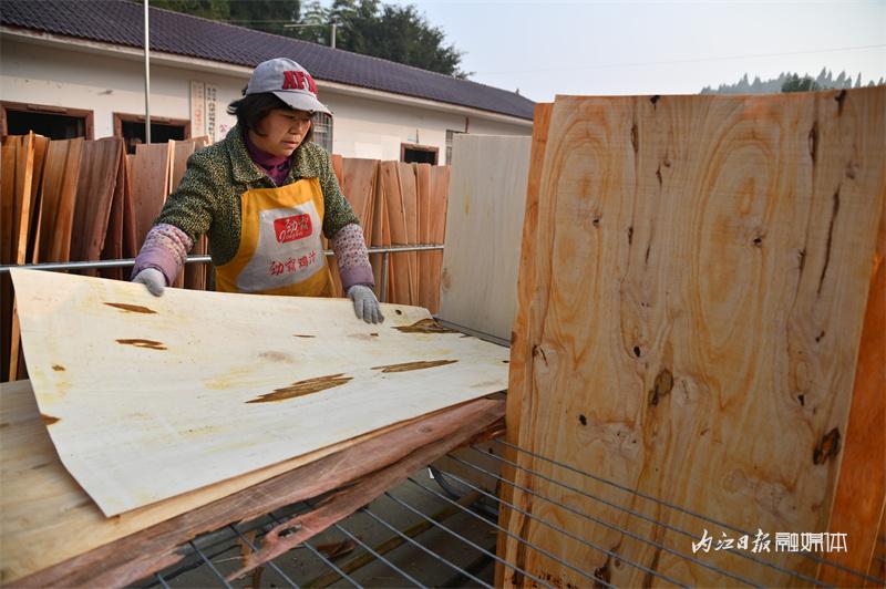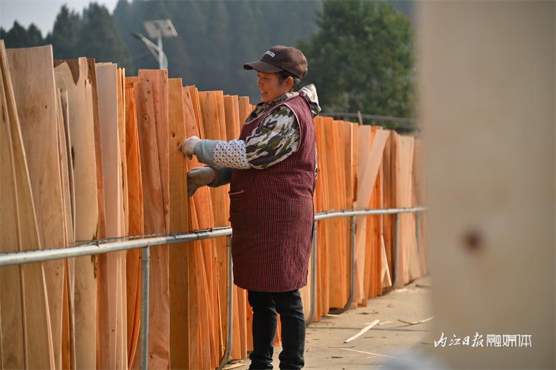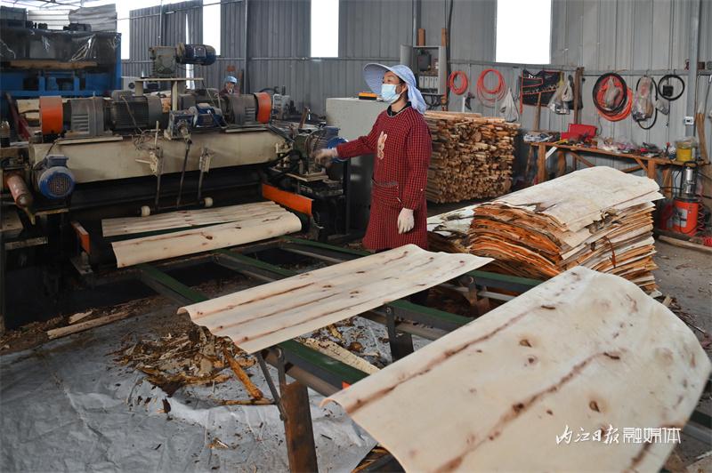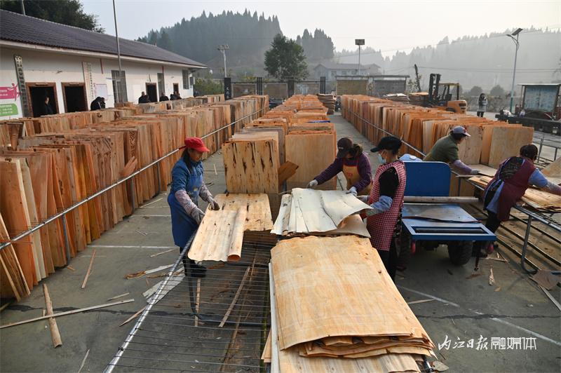 1月11日,内江市东兴区高梁镇鸳鸯桥村木材加工厂内一片忙碌,一根根粗细不等的原木被“推”上机械化的流水线,经过剥皮和旋切工序,一张张木片被堆叠到流水线尽头,等待转运。