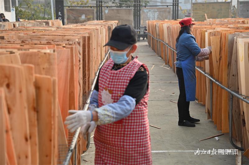 院坝上,摊晒中的木片散发着特有的木香,工人们配合默契,将木片一一卸下,然后架在一列特制的并排着的“摊晒床”上,让它们充分接受阳光和微风的洗礼。