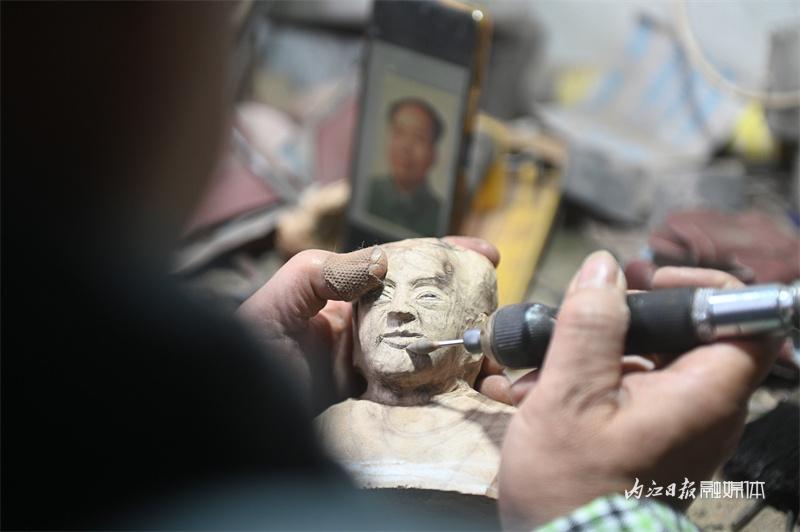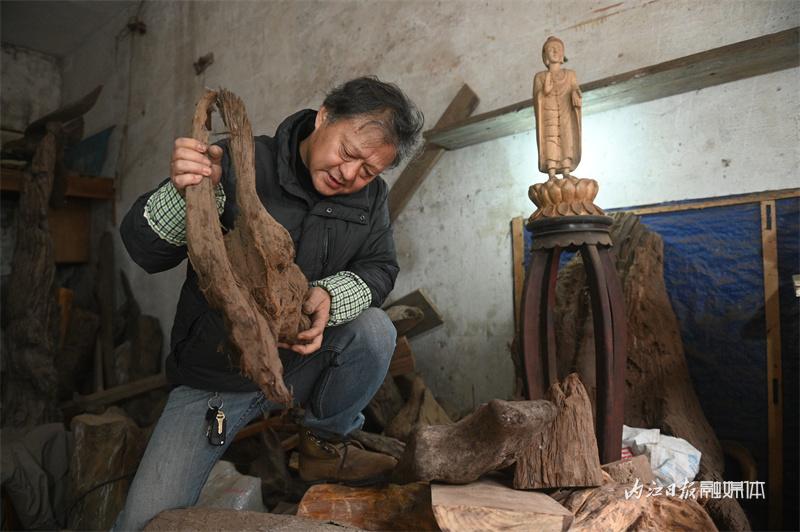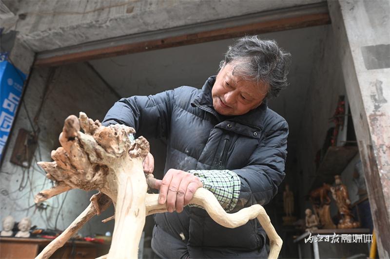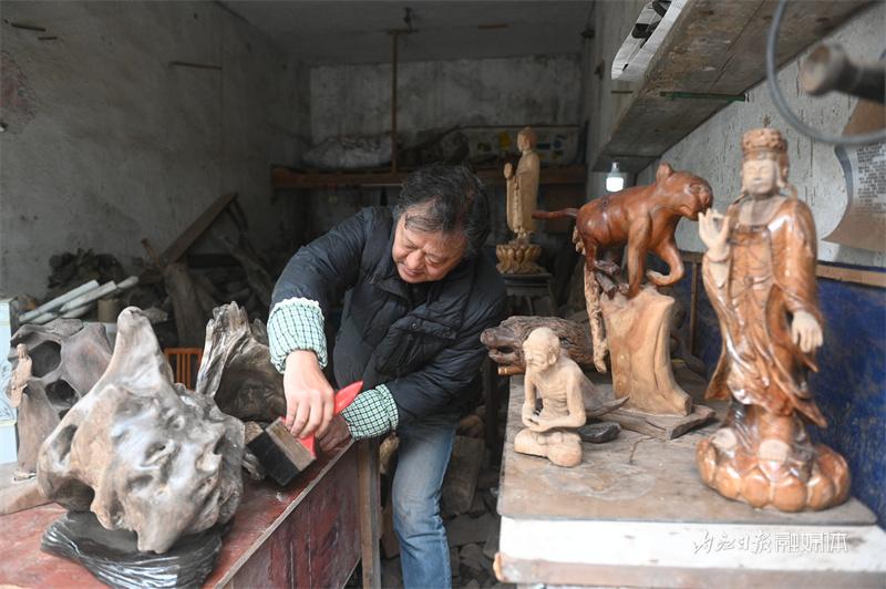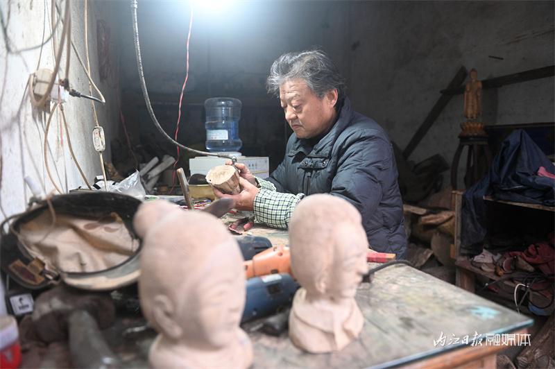 1月15日,位于内江市市中区白马镇司马路的一间雕刻工作室,冯泳正在制作雕刻作品。