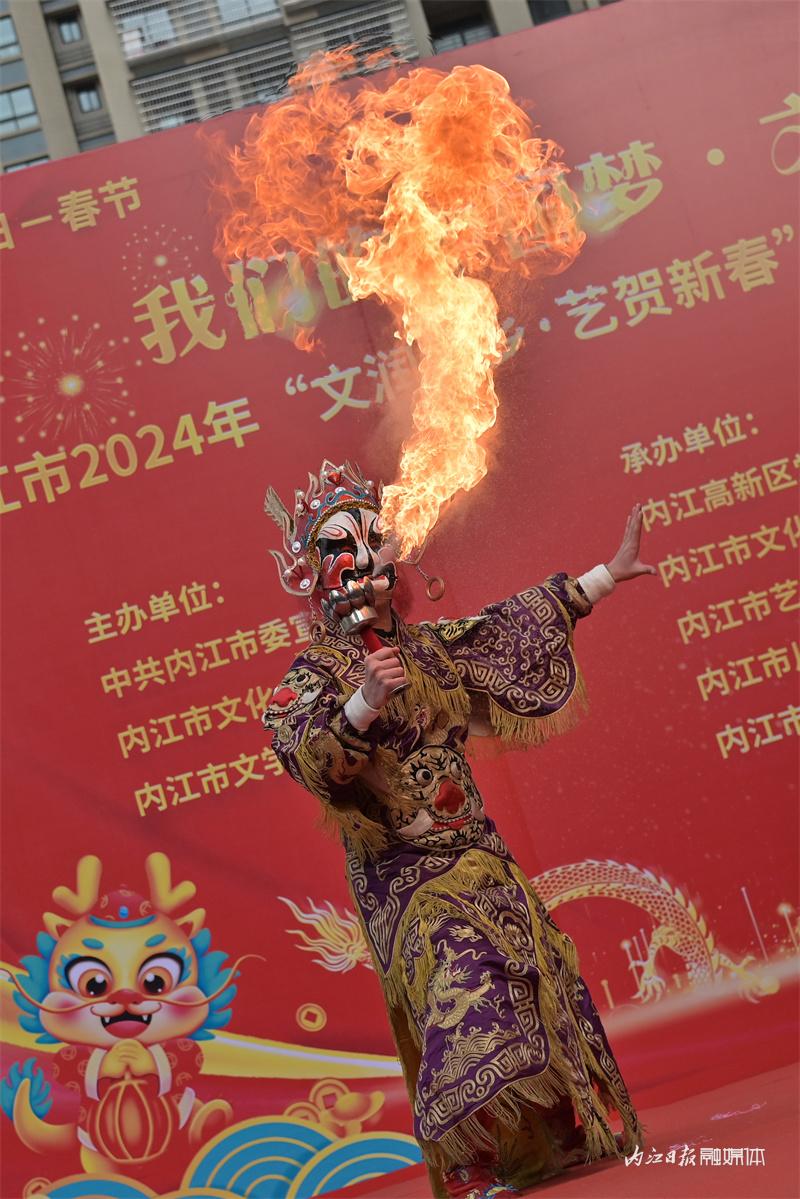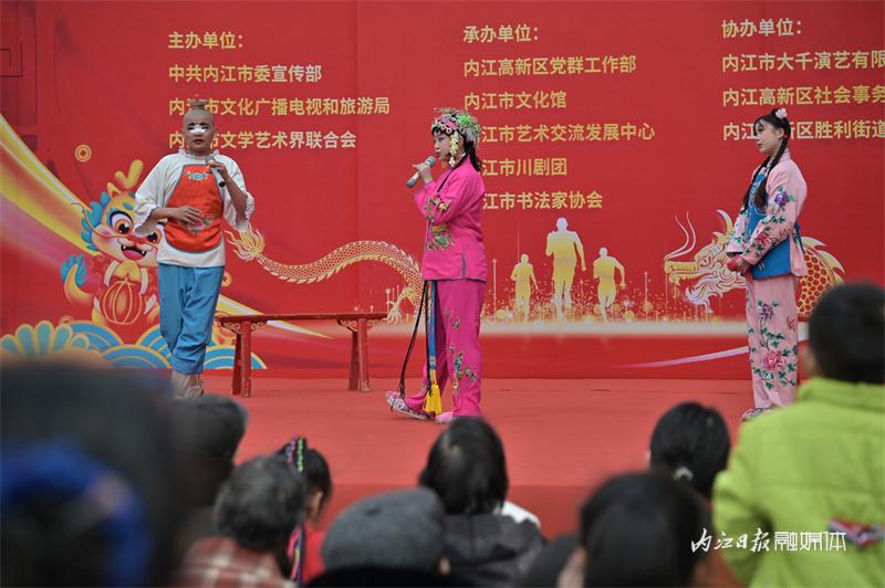 “春风十万里,十万好消息……”下午3时许,歌伴舞《春风十万里》、群舞《盛世欢歌》、川剧折子戏片段《滚灯》、女声独唱《美丽家园》、 京剧表演唱《天女散花》、川剧绝活《变脸·吐火》、水袖舞《踏雪寻梅》、二胡独奏《北京有个金太阳》、葫芦丝独奏《竹林深处》等特色节目轮番登场,现场一片欢乐喜庆的节日氛围。