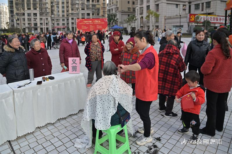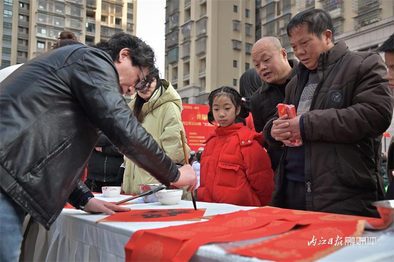 “大师,帮我写一副对联嘛。”“我也要一副!”舞台另一边,写春联、送福字、剪纸、义诊、义剪等志愿服务活动同步开展,志愿者引导市民有序参与活动,市民们纷纷点赞。