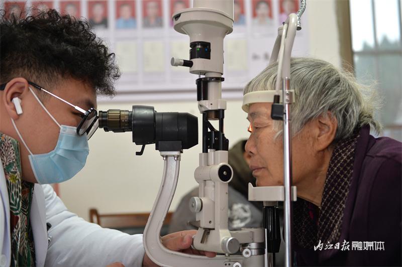 志愿者给老人检查眼疾