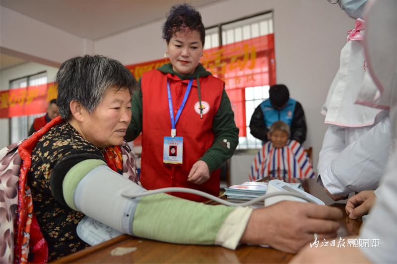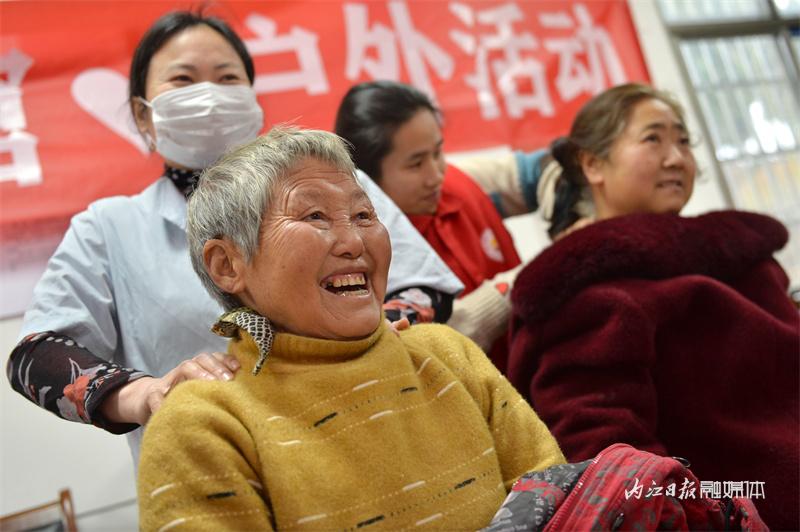室外寒冷刺骨,室内温暖如春。在四方碑村村委会会议室内,志愿者们分别为老人义诊、义剪、按摩。“阿姨,您血压有点高,平时要记到吃压降药哦。”来自内江市第二人民医院的志愿者提醒老人。