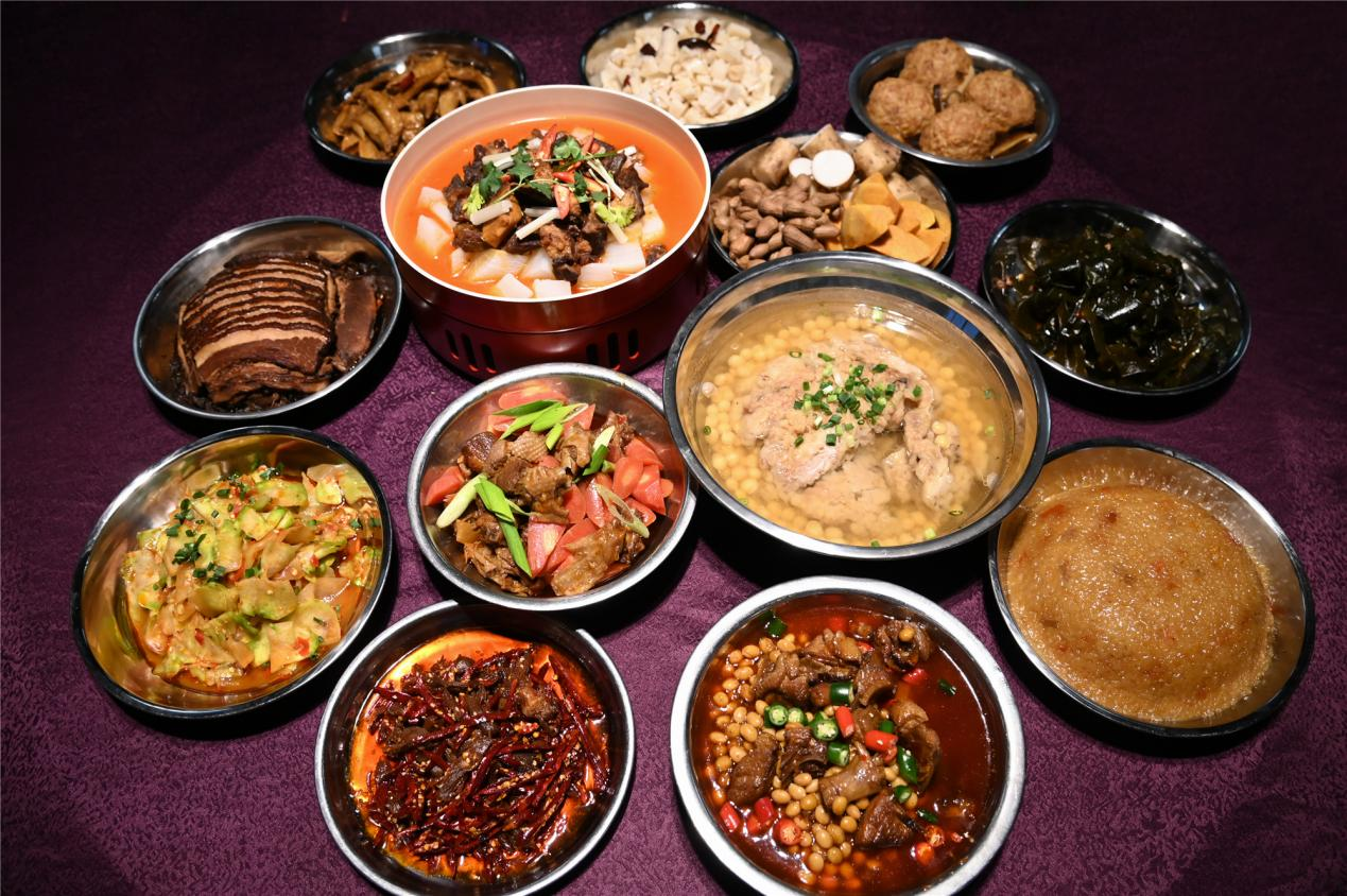 菜品共有13个:八宝饭、冬尖烧白、四喜丸子、辣卤海带节、黄豆烧鹅、红烧牛腩、素炒藕丁、红萝卜烧鸡、浓汤香碗、拌棱角菜、辣卤凤尖、风味手撕肉,五香粗粮。
