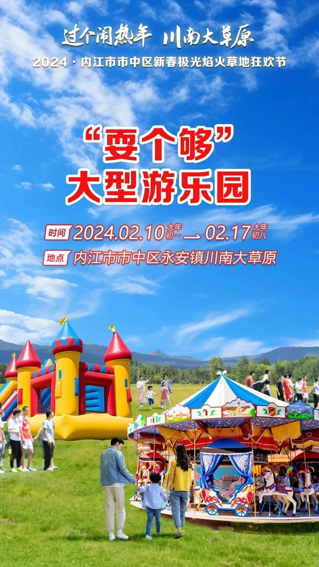 川南大草原“耍个够”游乐园营业时间为2024年2月10日到2月17日(农历大年初一到初八)。
