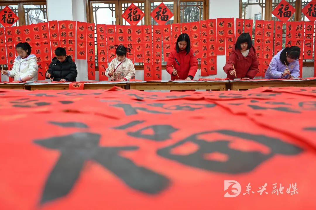 活动现场,红联铺展、毛毫浸染。20余名小小“书法家”挥毫泼墨,专心致志地在红纸上书写春联和“福”字。不一会,“龙腾瑞气伴福来”“辰龙玉海驾波来”“龙展宏图铺万里”“出海金龙迎盛世”等与“龙”相关的美好词汇跃然纸上,汇聚成对仗整齐、构思巧妙的春联。
