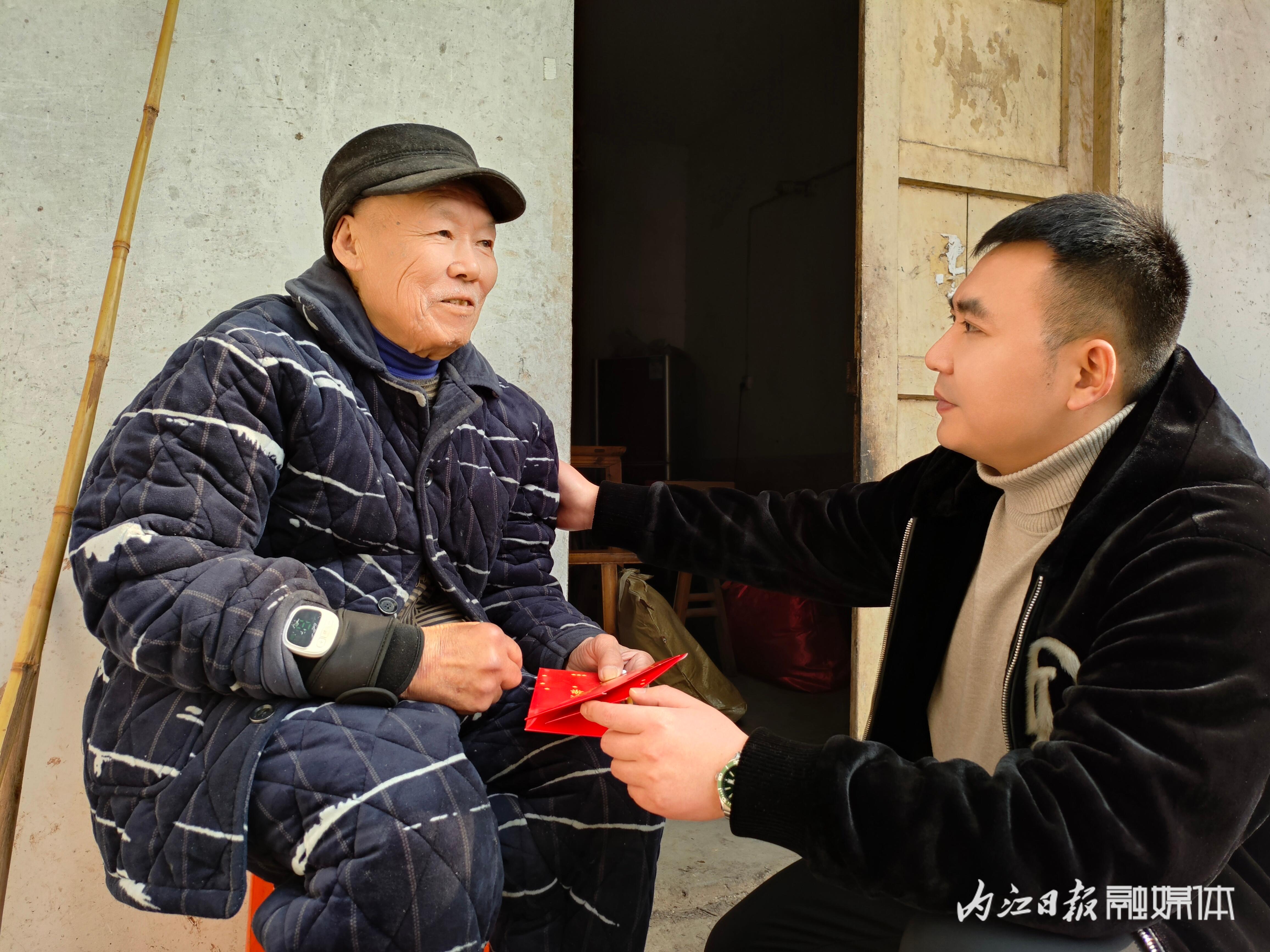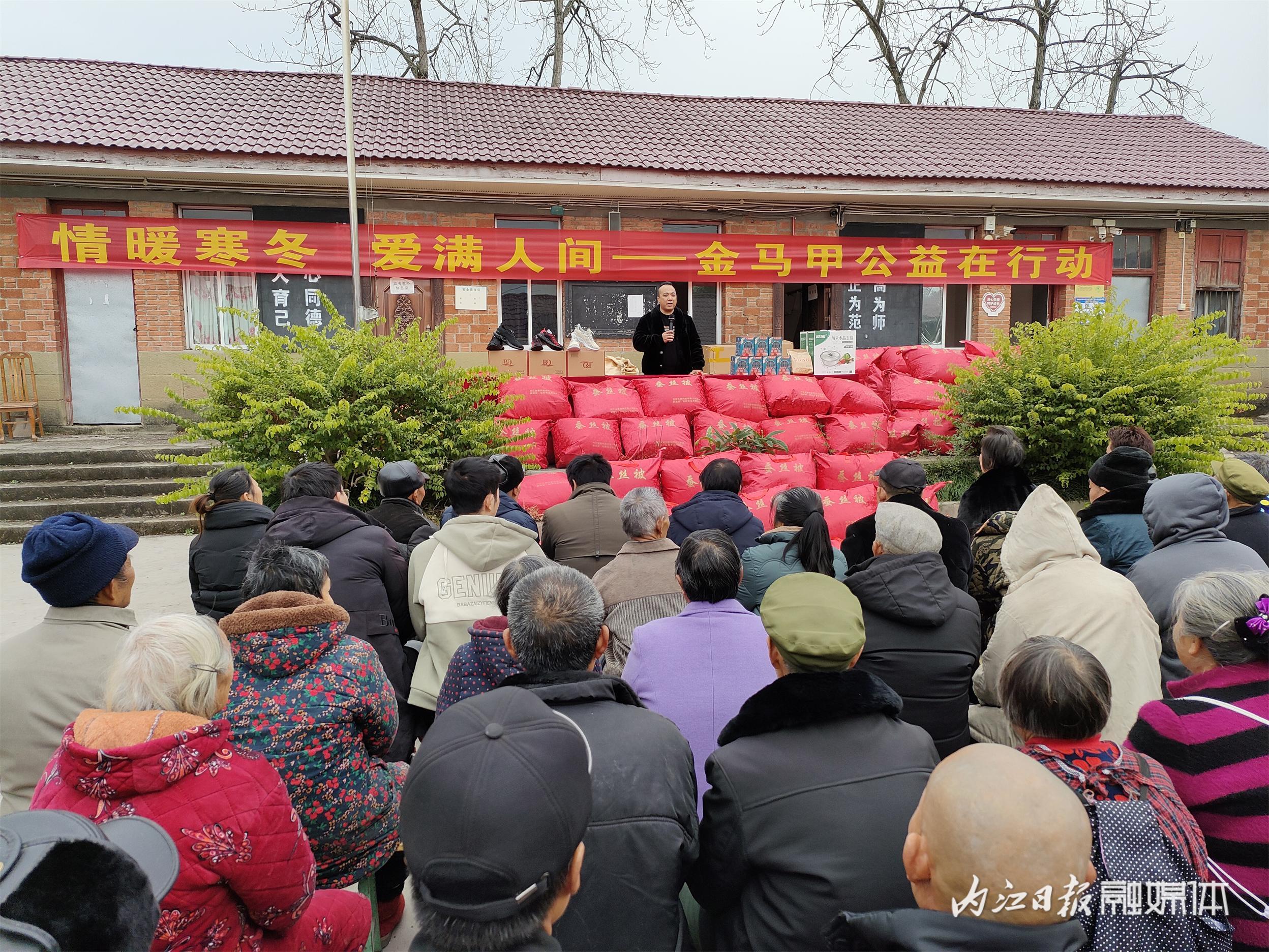 2月1日,春节来临之际,内江“金马甲”公益团队走进市中区朝阳镇周坡村,为该村贫困户、残疾人士等困难群体送上蚕丝被、蚕沙垫、按摩鞋等暖冬物资或慰问金,用爱心诠释责任,把浓浓的关怀和温暖送到他们心中。
