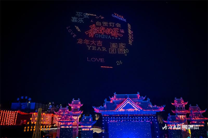 随着灯会亮灯,由2024架无人机组成的巨龙腾空而起,不断变换出龙凤呈祥、盐都景象、自贡恐龙等图案,宛如夜空中的星河,与现场灯光交相辉映,共迎八方宾客。