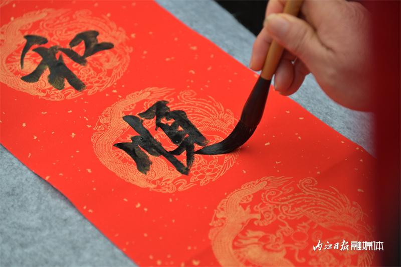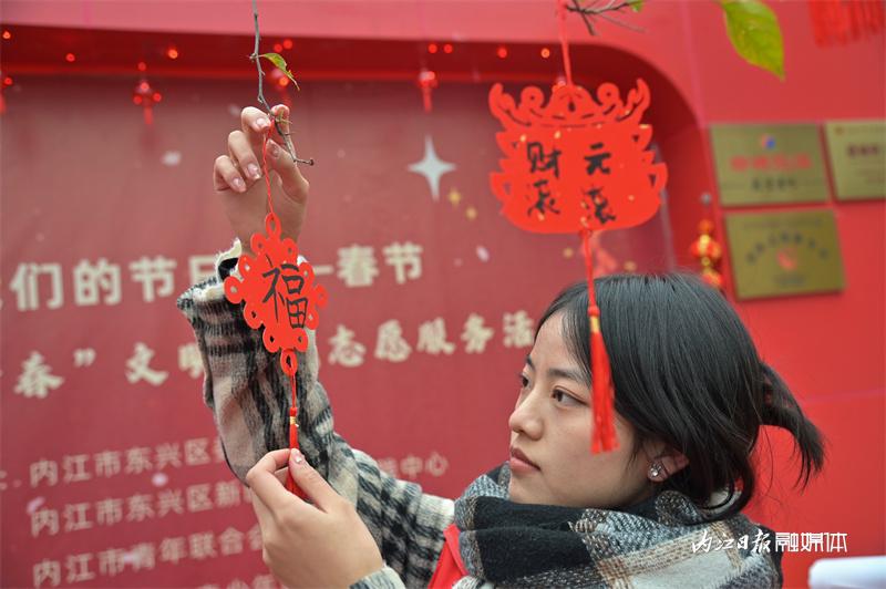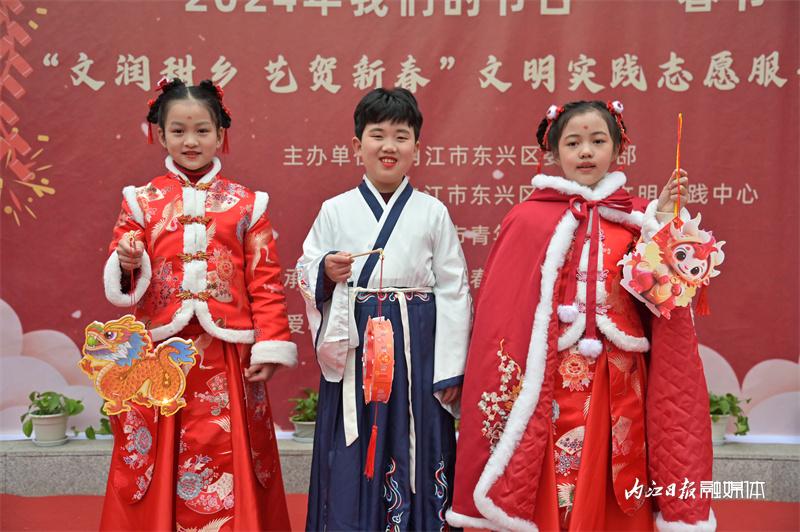 文润甜乡,艺贺新春。2月3日,内江市东兴区林荫大道新时代文明实践志愿服务点热闹十足,2024年“我们的节日——春节”文明实践志愿服务活动在此举行,市民络绎不绝前来围观。