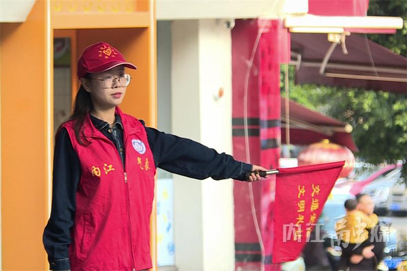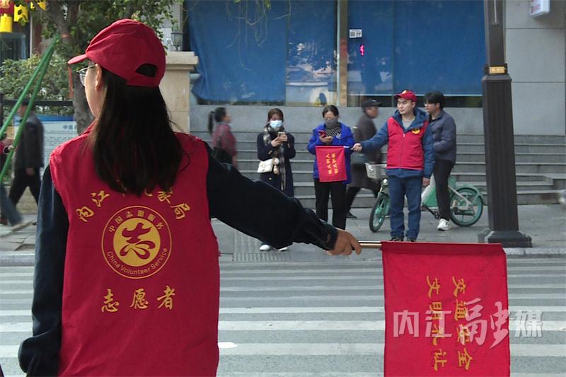 当日下午,记者在市中区南环路与江华街交叉路口看到,来自内江市气象局的志愿者身着红马甲、头戴小红帽、手握文明交通引导旗值守在十字路口,对不按指示灯过斑马线的行人、不礼让行人的司机进行劝导,对有需要的行人提供帮助。