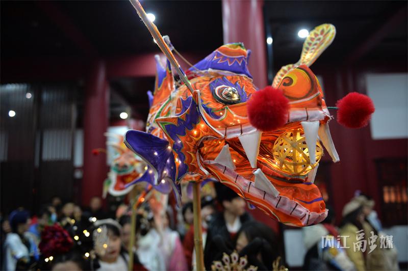当晚,记者在现场看到,数十名身着汉服的表演者手持象征如意吉祥的灯龙、灯鱼等民间手工艺品,一路锣鼓齐鸣,登上太白楼。极具民族特色的展演让游客们大开眼界,大家纷纷举起手中的相机和手机定格这难得的瞬间。
