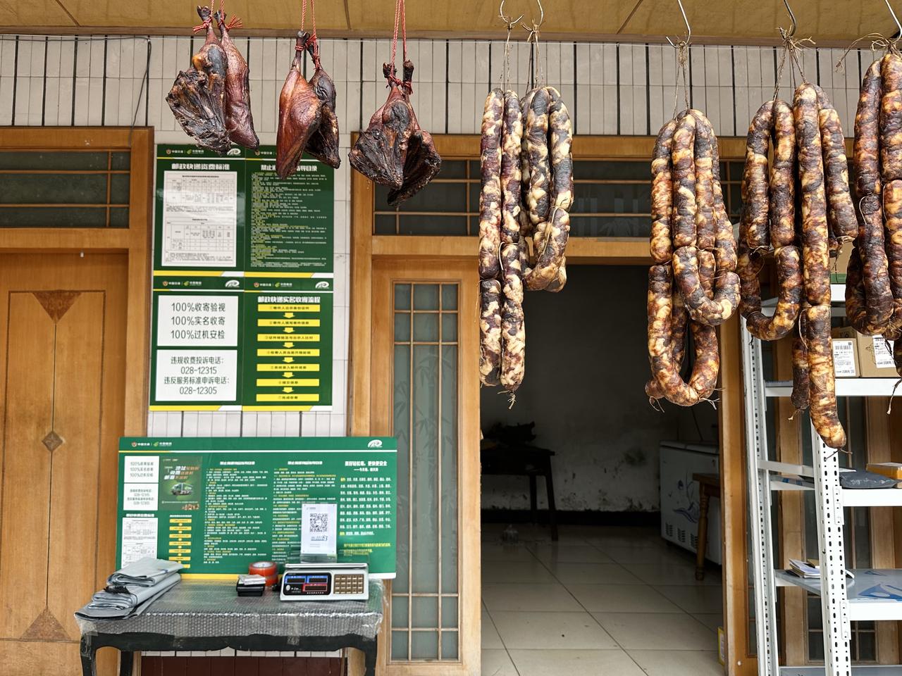 伍凯的家是典型的川西山区农家,院内稍显陈旧,却也十分整洁安静,新春期间,山间腊味挂满屋檐。屋檐下,各种快递包裹整齐地码放在置物架上,等待送出。