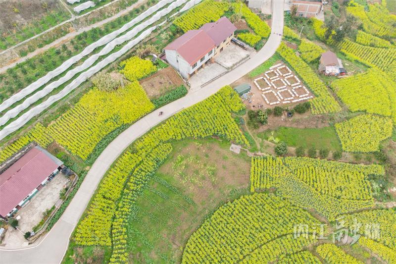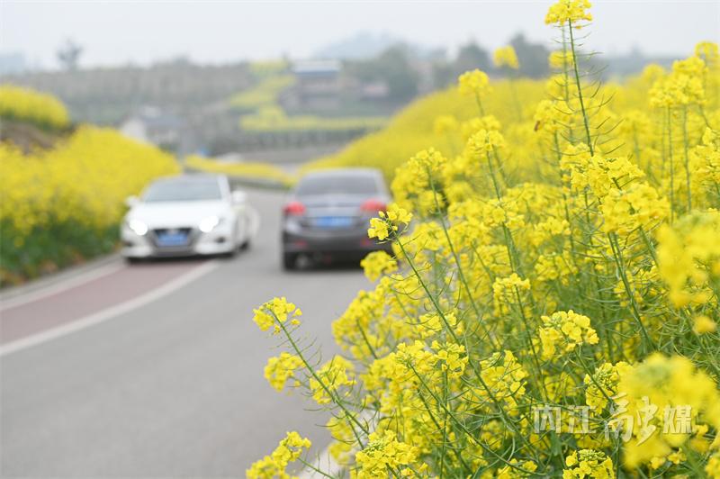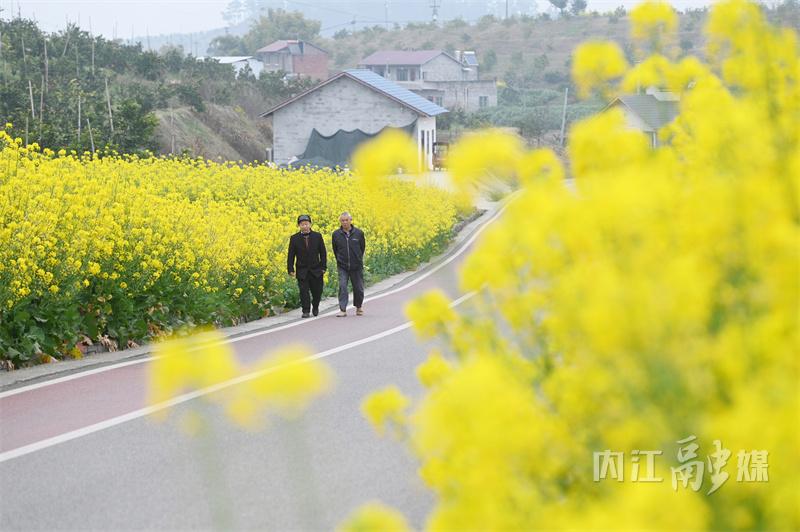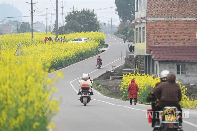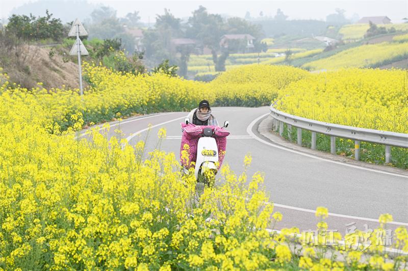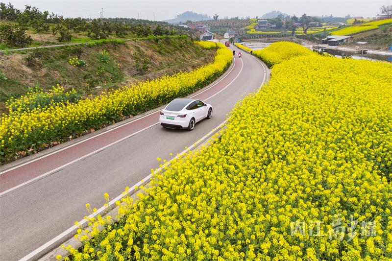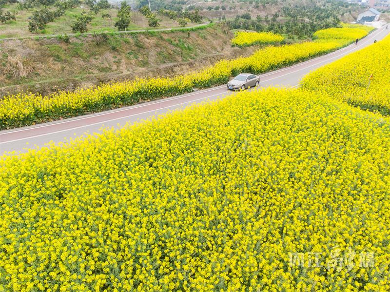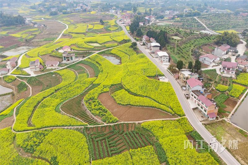 初春时节,资中县银山镇乡村公路两旁种植的油菜花竞相绽放,犹如一张张金黄色的地毯铺在大地上,与当地的田野、道路、河流及村庄相互映衬,勾勒出一幅秀美的乡村画卷。