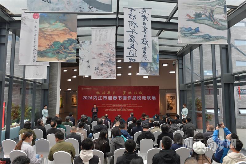 3月13日,“龙腾华夏•墨润甜城——2024内江市迎春书画作品校地联展”在内江师范学院美术馆开幕,内江书画家和内江师范学院师生代表等参加开幕式并观看展览。