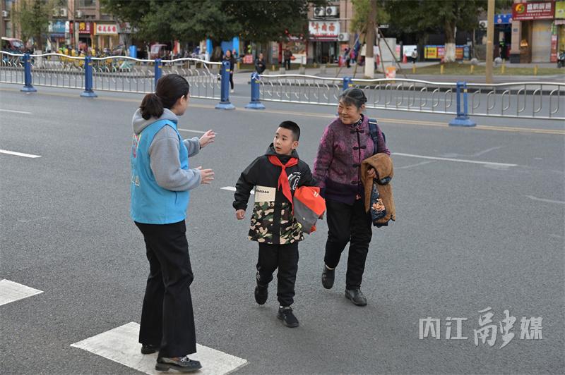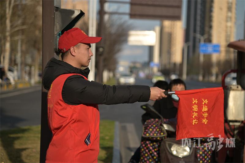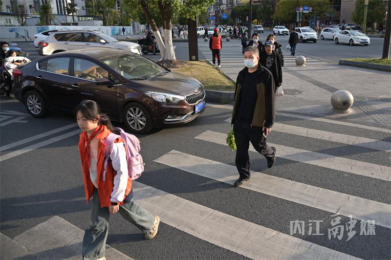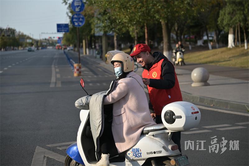 下午6时许,正值放学和下班高峰期,市医保局志愿者饶义琴与同事在东兴区栖霞路路段一边巡逻,一边引导司机和行人文明通行。