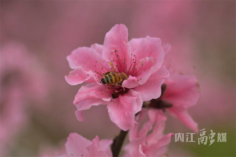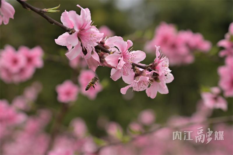 漫步桃林,蜜蜂辛勤采蜜,花香沁人心脾,一派春意盎然,吸引了众多游客前来观赏。